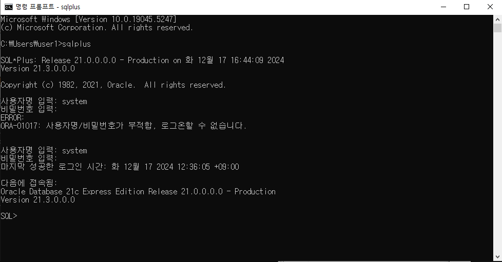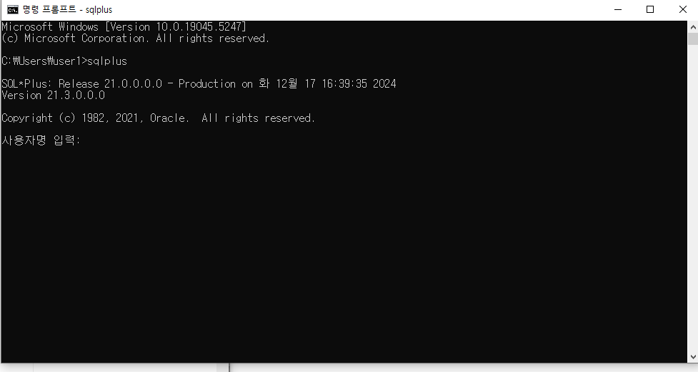 정상적으로 설치가 완료가 되었으면 명령 프롬포트에서 sqlplus로 접속이 가능해집니다.