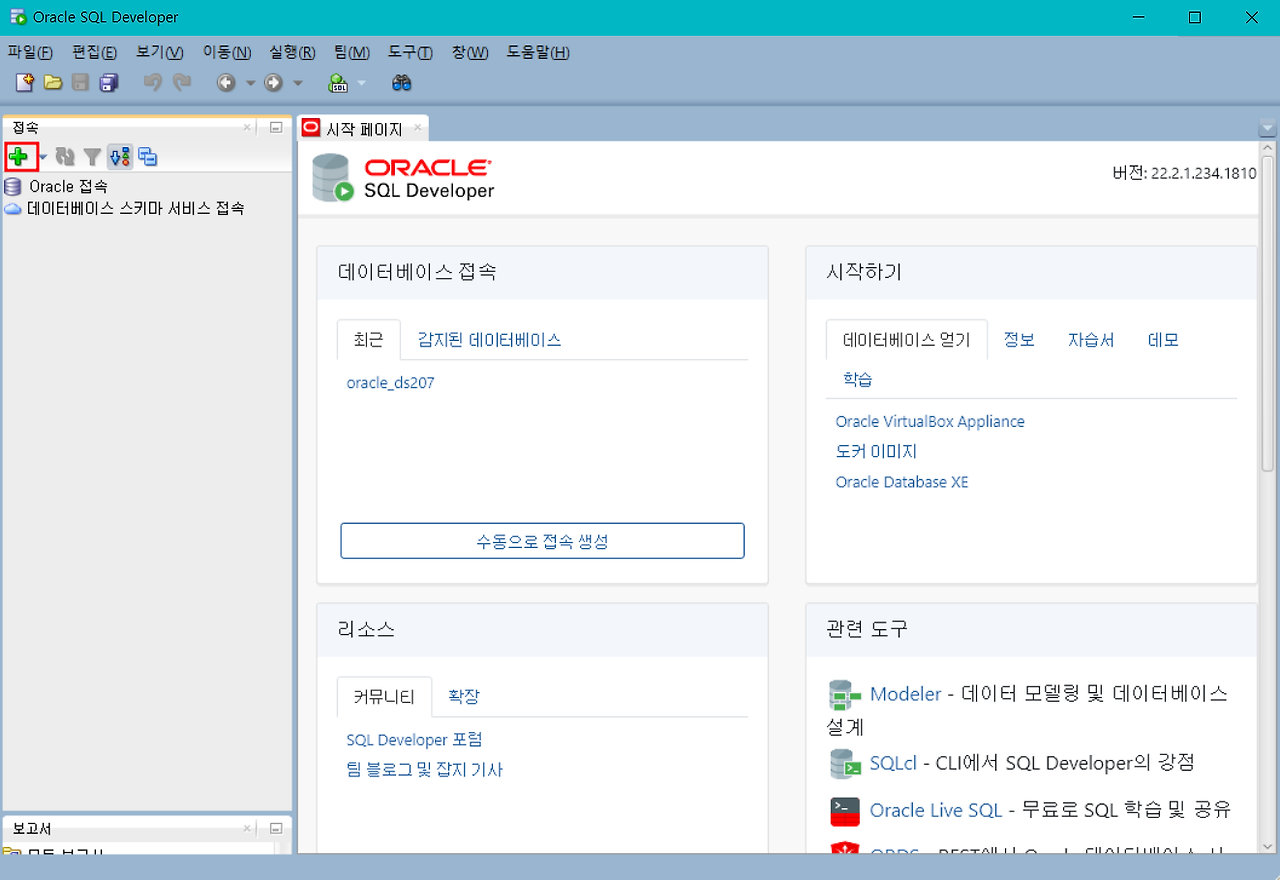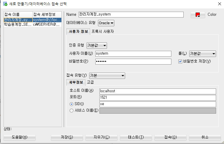 - 호스트 및 포트 : 데이터베이스가 위치한 서버의 IP 주소와 포트를 입력해야 하니다. 오라클 Database를 설치한 PC의 IP주소와 포트번호를 입력하면 됩니다.