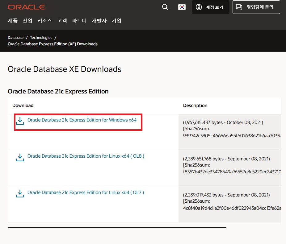 https://www.oracle.com/kr/database/technologies/xe-downloads.html