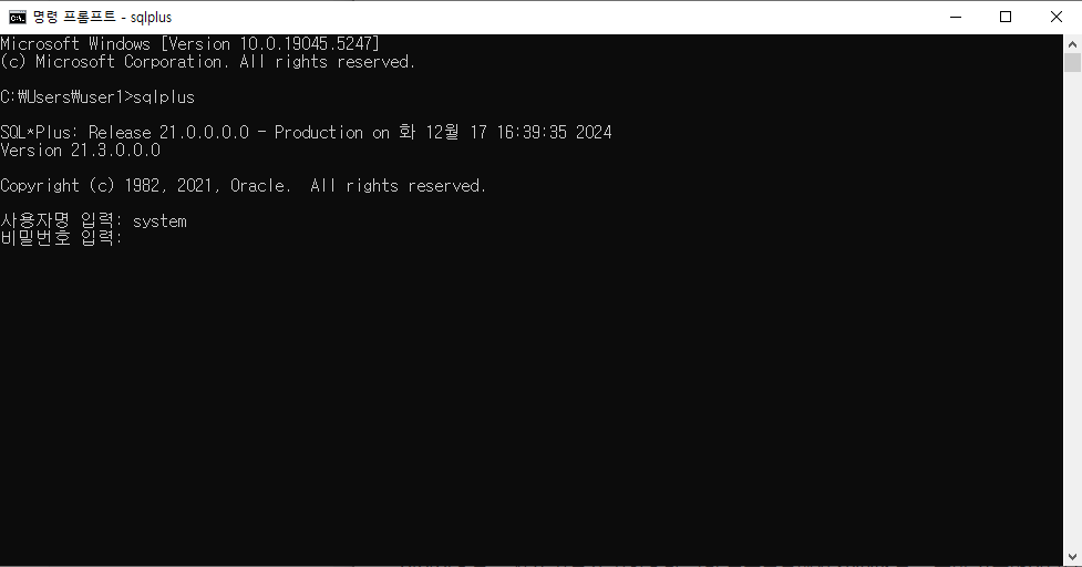 sqlplus를 입력하면 사용자명을 입력하라고 뜨는데 사용자명은 system을 입력하면 됩니다.