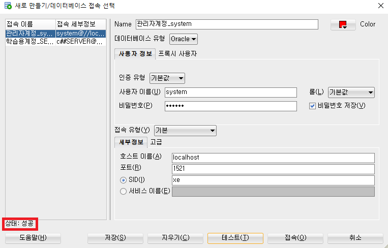 - 사용자 이름 및 비밀번호 : 데이터베이스 계정 정보를 입력합니다. (Oracle 21C XE를 설치한 후 설치 확인 단계에서 입력했었던 사용자 명과 비밀번호를 입력하면 됩니다.