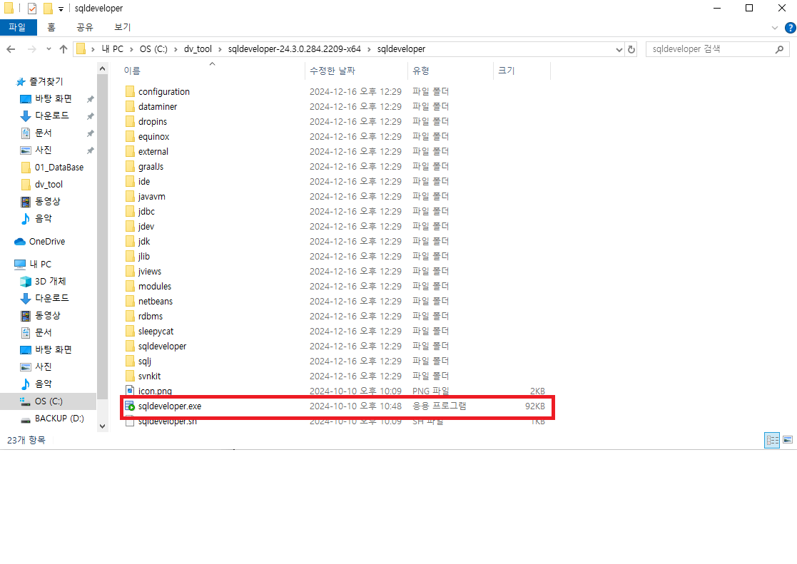 압축을 풀어준 폴더에서 sqldeveloper.exe를 실행시킵니다.